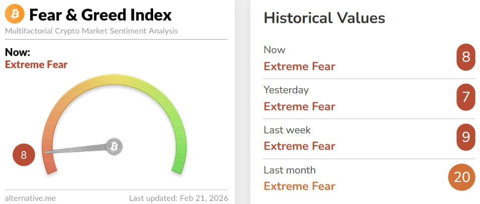 Отдельно настроение участников рынка подчеркивает индекс страха и жадности: по состоянию на 21 февраля 2026 года он снизился до 8 пунктов, указывая на «экстремальный страх».