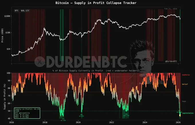 По наблюдениям аналитика под псевдонимом DurdenBTC, доля находящегося в прибыли предложения биткоина находится на нулевом процентиле.