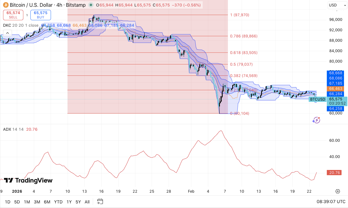 Кроме того, биткоин торгуется ниже кластера сопротивления $66,400–$68,600. Этот диапазон совпадает с средними и верхними полосами Donchian. Устойчивое движение выше $68,600 может открыть пространство к $70,400.