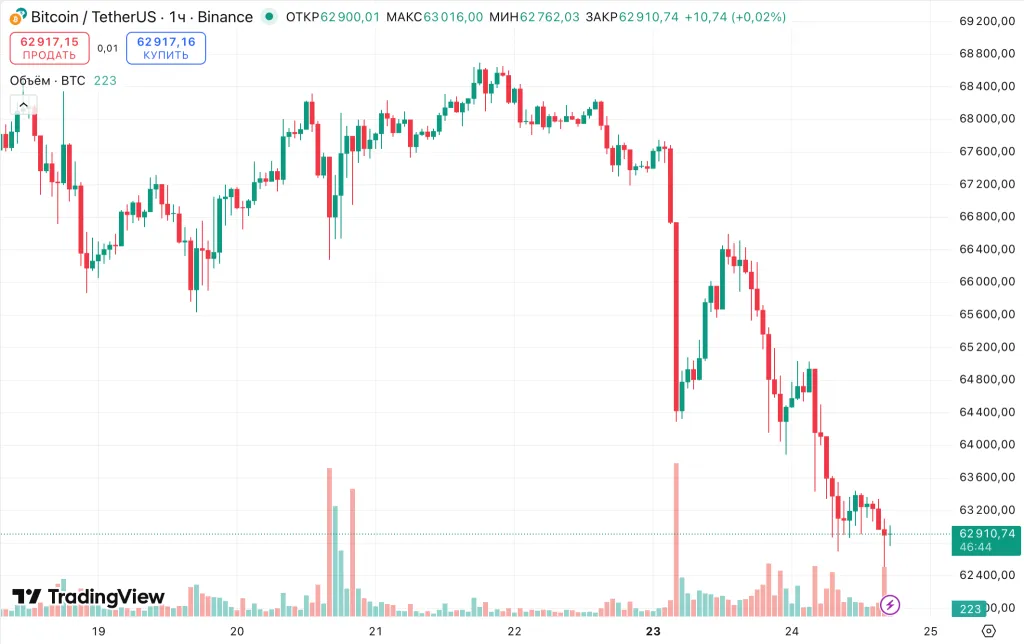 На момент написания биткоин торгуется около $62 900, подешевев на 5% за последние сутки.