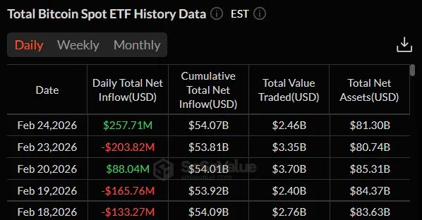 Несмотря на массовые распродажи в конце прошлого года, 24 февраля чистый приток средств в спотовые биткоин-ETF составил $257,71 млн. Больше всего средств привлек фонд FBTC от компании Fidelity — $82,8 млн.