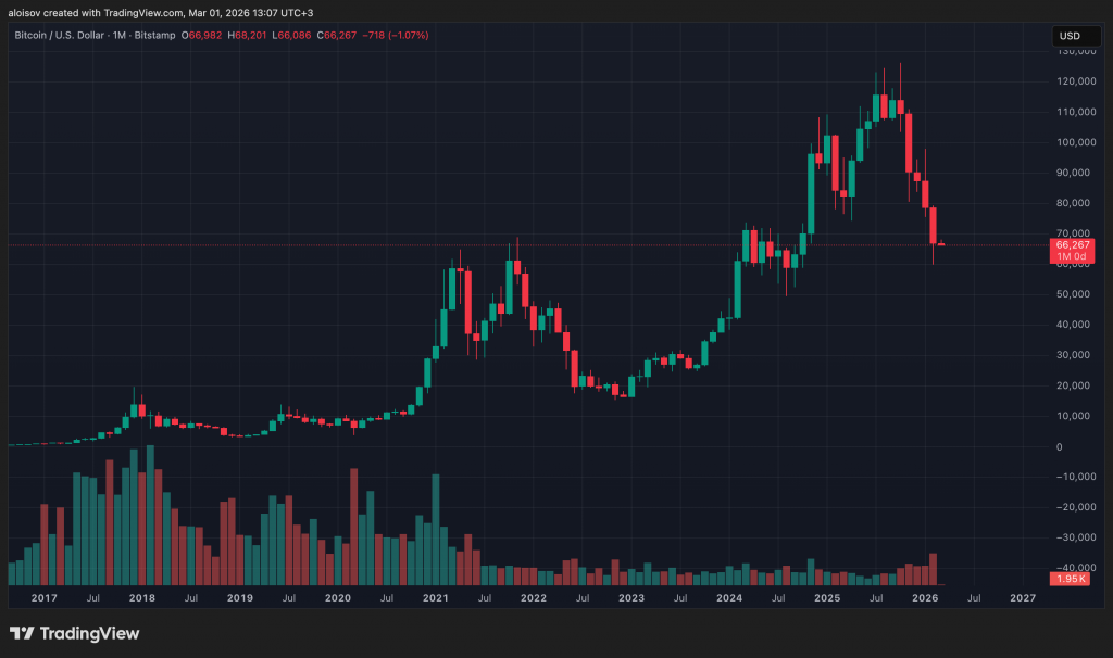 Неделя открылась падением ниже $65 000: решение Трампа повысить глобальный тариф с 10% до 15% спровоцировало ликвидации длинных позиций на $230 млн. Биткоин движется к закрытию пятого подряд «красного» месяца — второй подобный случай в недавней истории. Аналитик Rekt Capital предупреждает: 200-недельная EMA теперь выступает сопротивлением, а исторически самый короткий медвежий рынок длился 365 дней — текущий насчитывает лишь около 140.