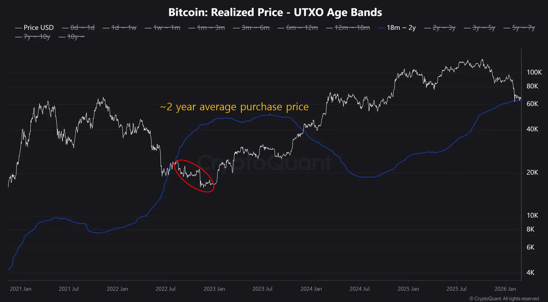 Реализованная цена инвесторов в возрасте от 18 до 24 месяцев. Данные: CryptoQuant.