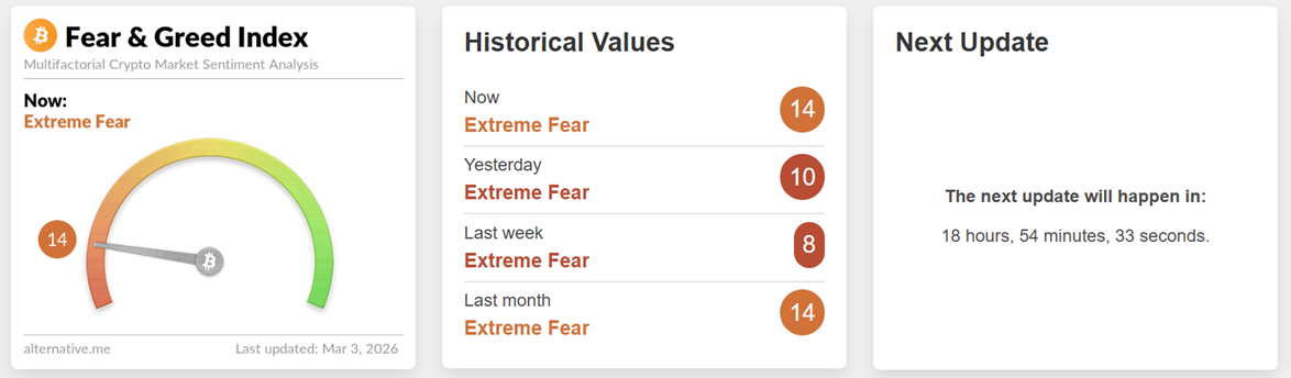 Индекс страха и жадности находится в зоне экстремального страха, прибавив четыре пункта.