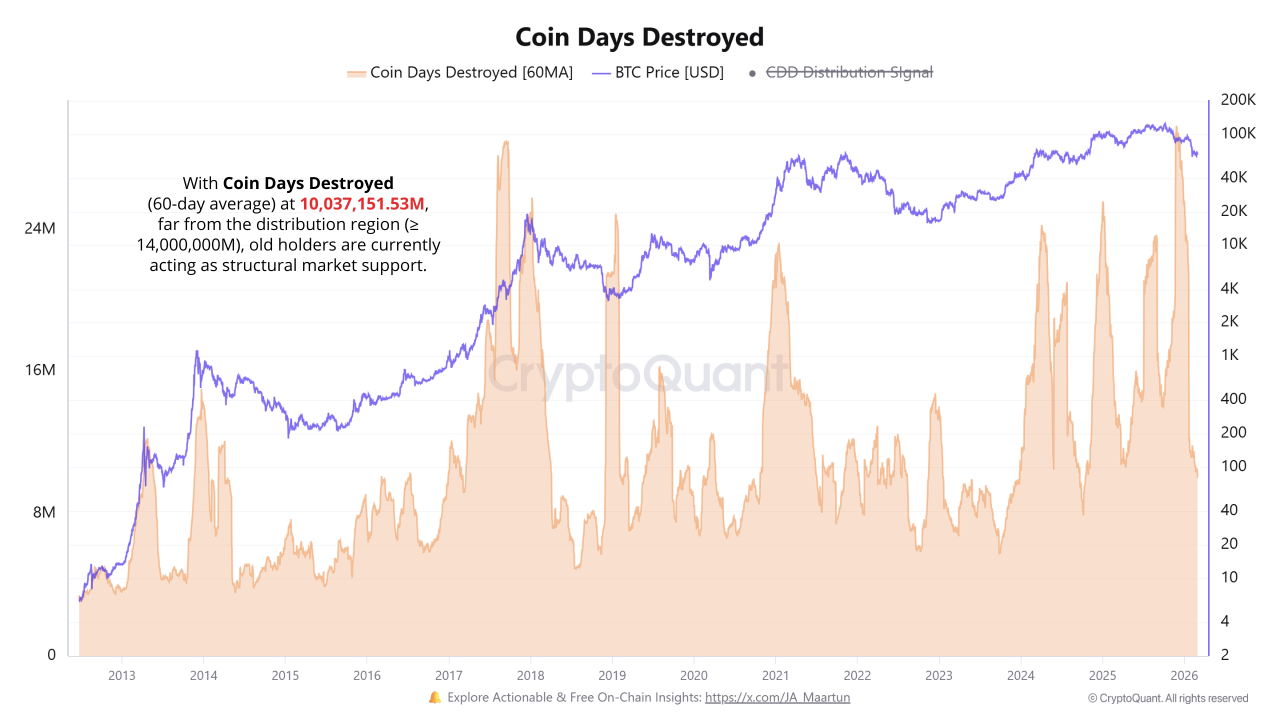 По данным CryptoQuant, метрика Coin Days Destroyed подтверждает отсутствие давления со стороны долгосрочных держателей. Киты могут выступать в роли продавцов на сопротивлении $70 000, согласно индикатору Exchange Whale Ratio.