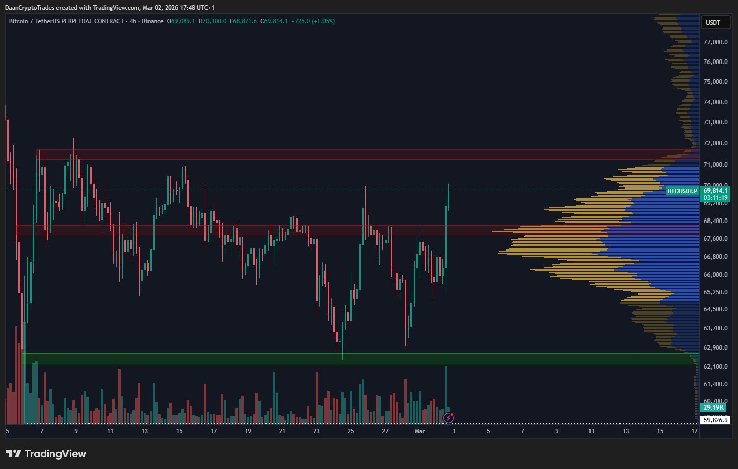 Трейдер под ником Daan Crypto Trades указал на $72 000 в качестве ключевого уровня для развития восходящей динамики. Удержание быками отметки в $68 000 сохранит за ними текущее доминирование.