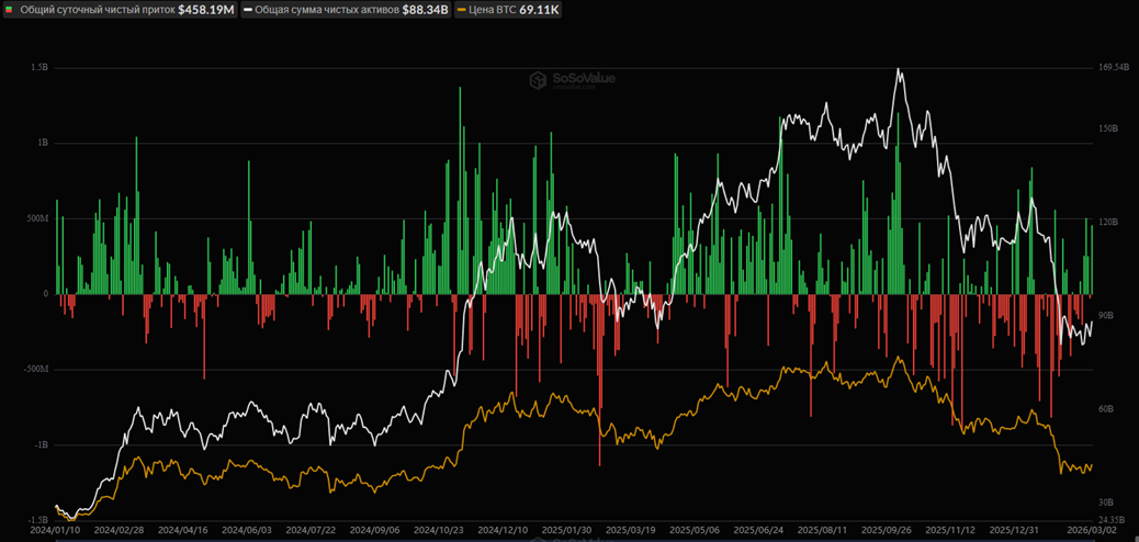 По данным SoSoValue, за сутки спотовые биткоин-ETF зафиксировали чистый приток в размере $458,2 млн. За последние пять торговых дней отток наблюдался только один раз.