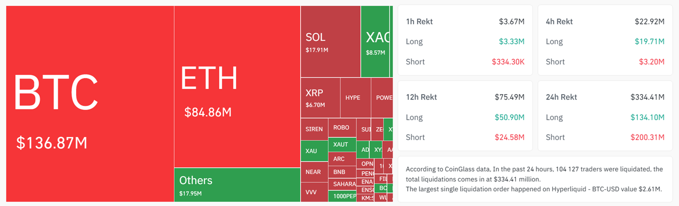 По данным Coinglass, ликвидации шортов по биткоину ($90,9 млн) вдвое превысили ликвидации лонгов ($45,9 млн).