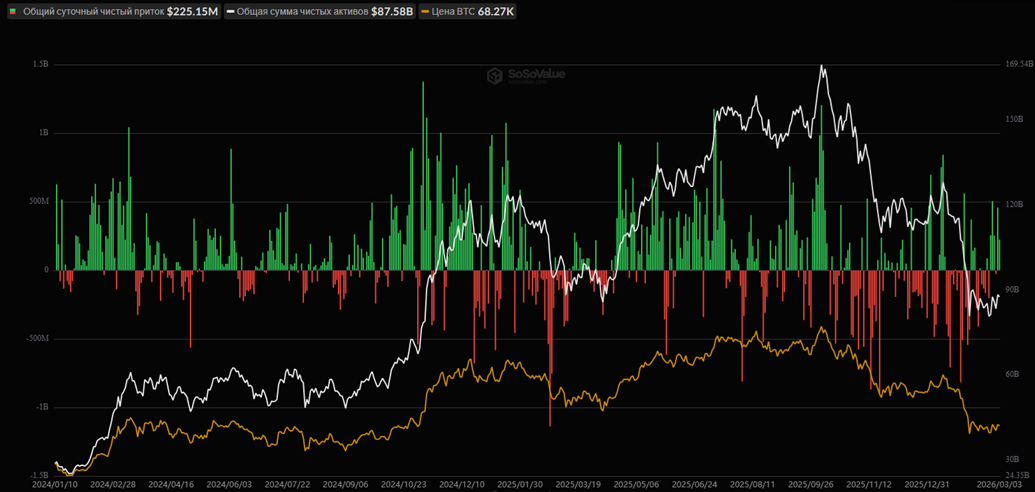 За сутки спотовые $BTC-ETF зафиксировали чистый приток в размере $225,2 млн. Положительная динамика продолжилась второй день подряд.