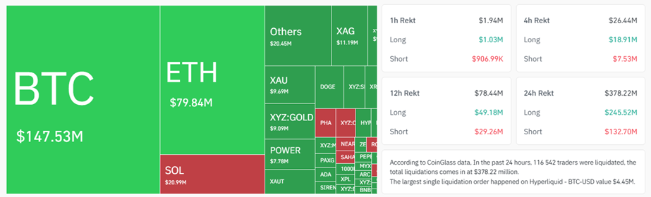 По данным Coinglass, ликвидации лонгов по биткоину ($87,2 млн) в полтора раза превысили ликвидации шортов ($60,3 млн).