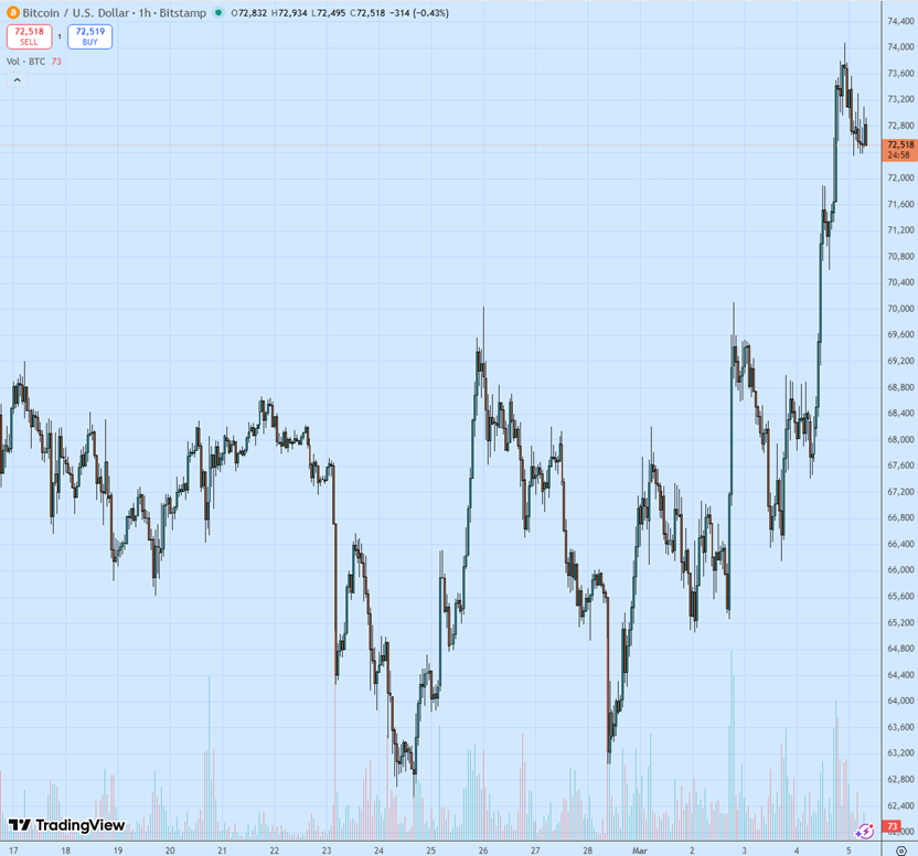 4 марта биткоин ($BTC) преодолел верхнюю границу коридора $63 000-70 000, последовательно взяв в дальнейшем две высоты в $72 000 и $74 000.