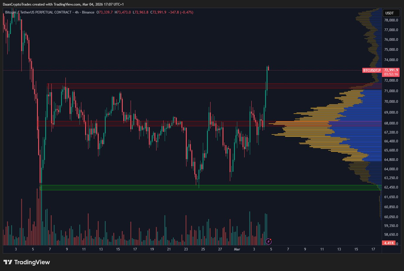 Трейдер под ником Daan Crypto Trades подчеркнул, что быкам важно удерживать курс выше $71 500-72 000. В случае подтверждения специалист рассчитывает на продолжение «охоты за стопами шортистов». Если пробой указанного диапазона не приведет к росту это станет признаком слабости. Текущую конструкцию Daan Crypto Trades назвал «довольно крепкой».