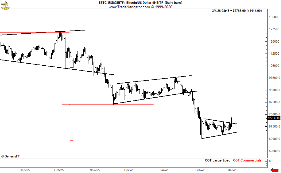 Продолжение позитивной динамики опиралось на сохранение заметных притоков в биржевые фонды и ликвидации коротких позиций после преодоления психологического уровня в $70 000. Следующая волна роста с пробоем $72 000 пришлась уже на начало американской сессии, где поддержку оказали вербальные интервенции властей США касательно ситуации вокруг Ирана.