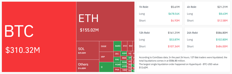 По данным Coinglass, за последние 24 часа ликвидации шортов по биткоину ($310,3 млн) сформировали 90% совокупного показателя.