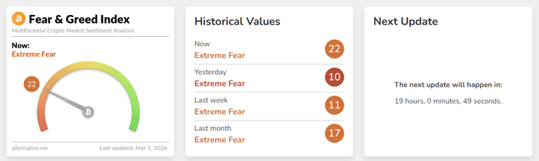 Индекс страха и жадности остался в зоне экстремального страха, подскочив на 12 пунктов.