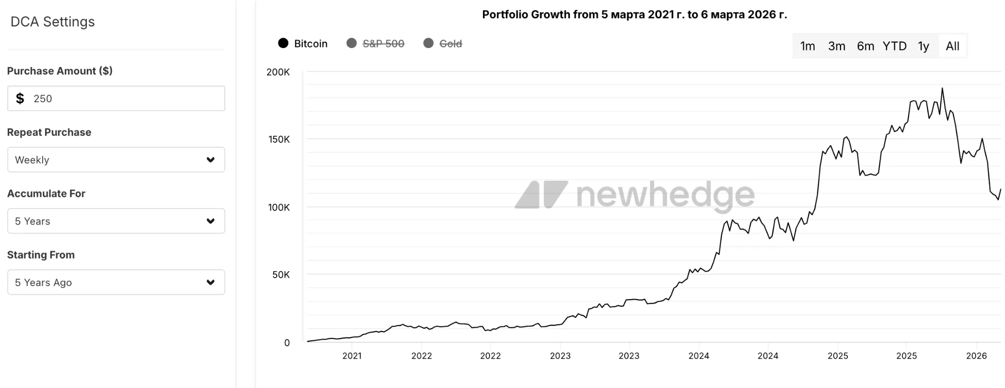 Сходная динамика прослеживается и при увеличении взносов до $250 в неделю на пятилетнем отрезке: первая криптовалюта вновь опережает S&P 500 по доходности, хотя лидером в этом сравнении остается золото.