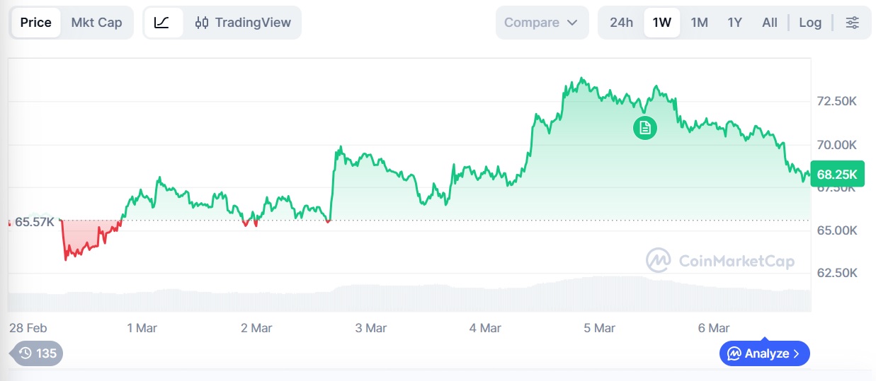 По данным CoinMarketCap, на момент публикации первая криптовалюта торговалась в районе $68 250, окончательно растеряв импульс после недавнего роста к $74 000.