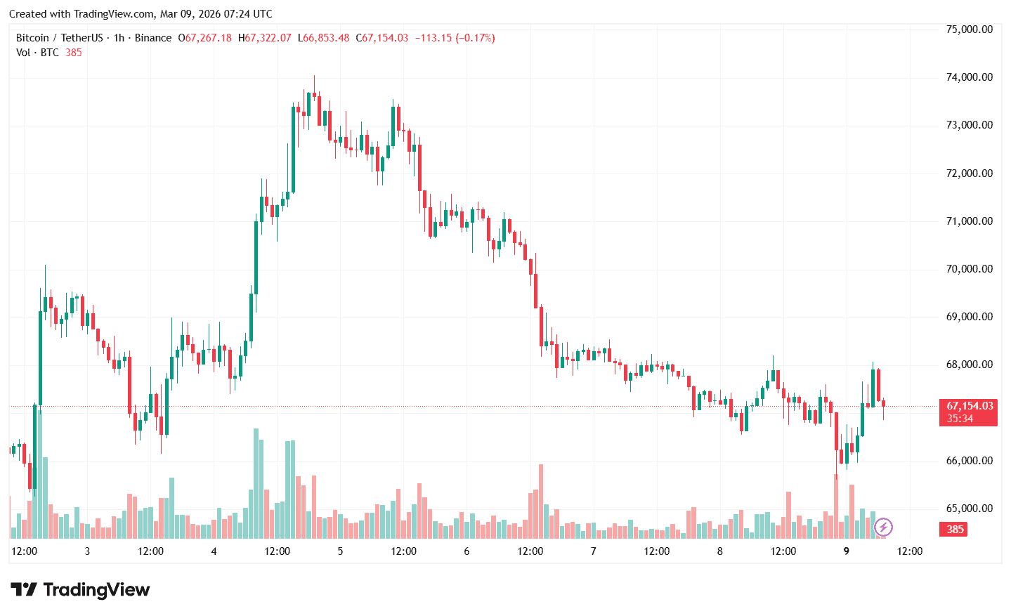 Утром 9 марта 2026 года курс биткоина опустился в моменте ниже $66 000, согласно TradingView. Актив отметился просадкой на фоне падения фондового рынка и роста цен на нефть.