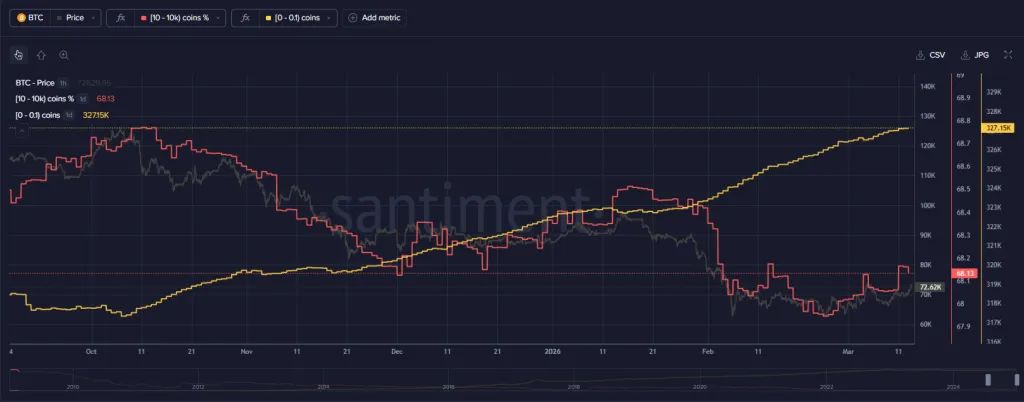 Речь идет о кошельках, хранящих 10-10 000 $BTC. Данная когорта инвесторов увеличила свою совокупную долю в рыночном предложении первой криптовалюты до значений выше 68%.