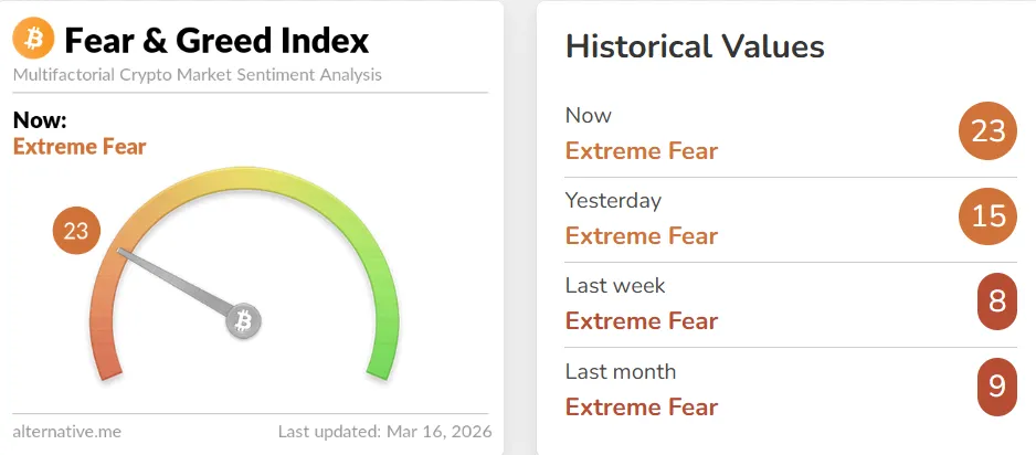 При этом общие настроения на рынке остаются пессимистичными — криптовалютный индекс настроений составляет 23, что указывает на фазу «экстремального страха».