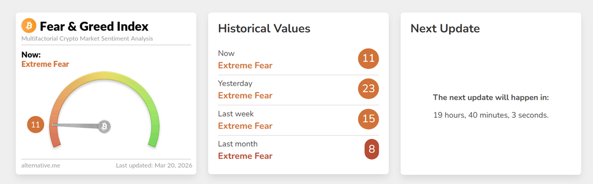 Индекс страха и жадности закрепился в зоне экстремального страха, обвалившись с 23 до 11 пунктов.