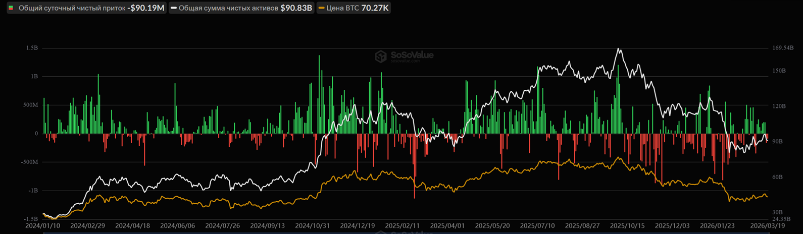 Отток из спотовых $BTC-ETF составил $90,2 млн. Негативная динамика продолжилась второй день подряд.