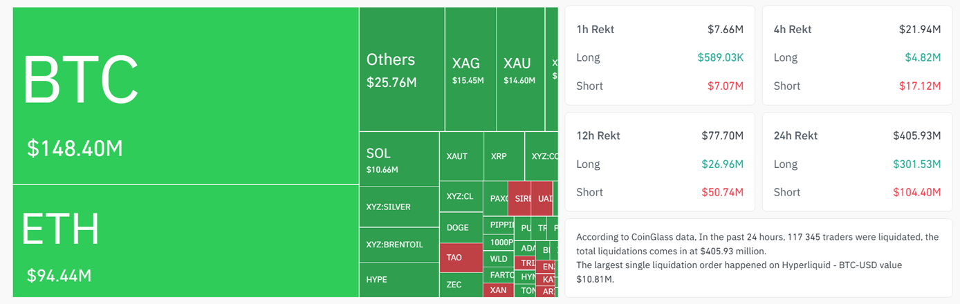 По данным Coinglass, за последние 24 часа ликвидации лонгов по биткоину ($109,1 млн) почти втрое превысили ликвидации шортов ($39,3 млн).