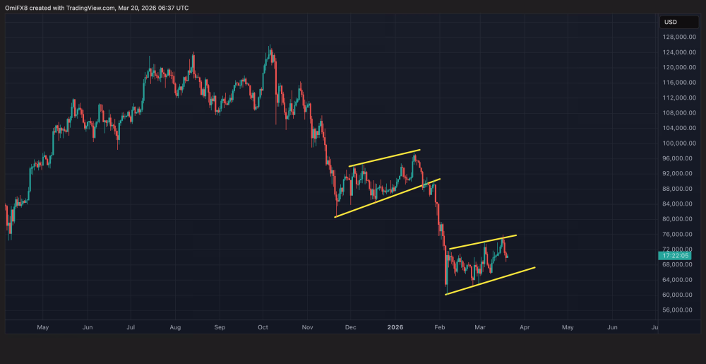 Если биткоин упадет ниже нижней линии тренда своего текущего канала — около $65 800, — это может сигнализировать о возвращении медвежьего контроля.