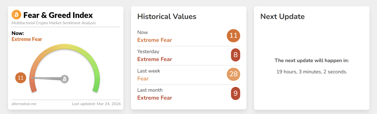 Индекс страха и жадности повысился с 8 до 11 пунктов, сохранив позиции в зоне экстремального страха.