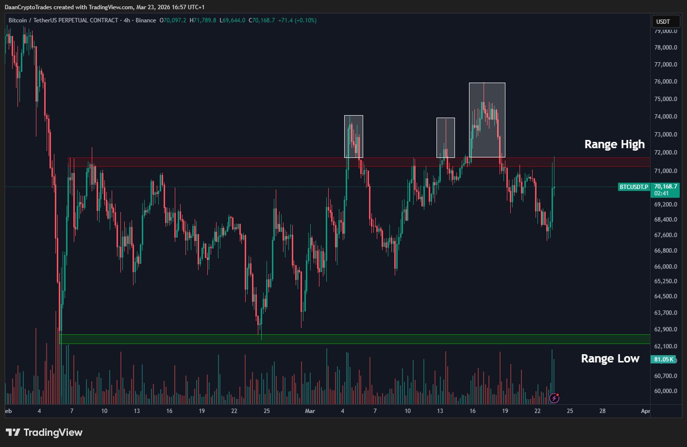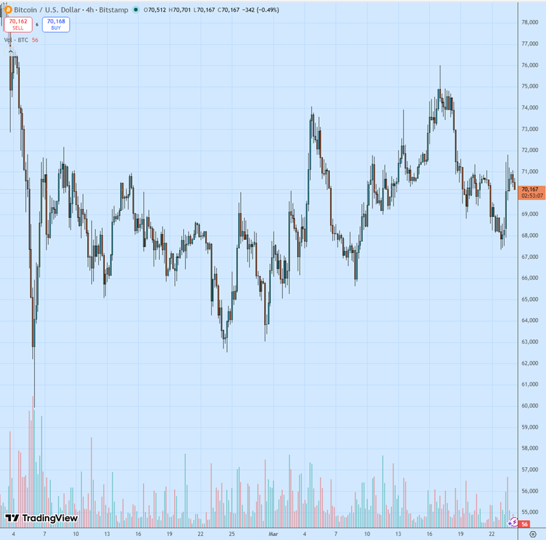 23 марта консолидация биткоина ($BTC) разрешилась выстрелом к $71 000 и выше на комментариях от Трампа. В дальнейшем динамика приобрела боковой характер с нижней границей выше $70 000.