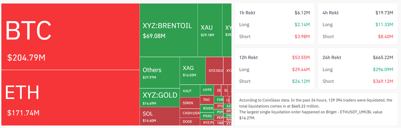 По данным Coinglass, за последние 24 часа ликвидации шортов по биткоину ($155,3 млн) втрое превысили ликвидации лонгов ($49,6 млн).