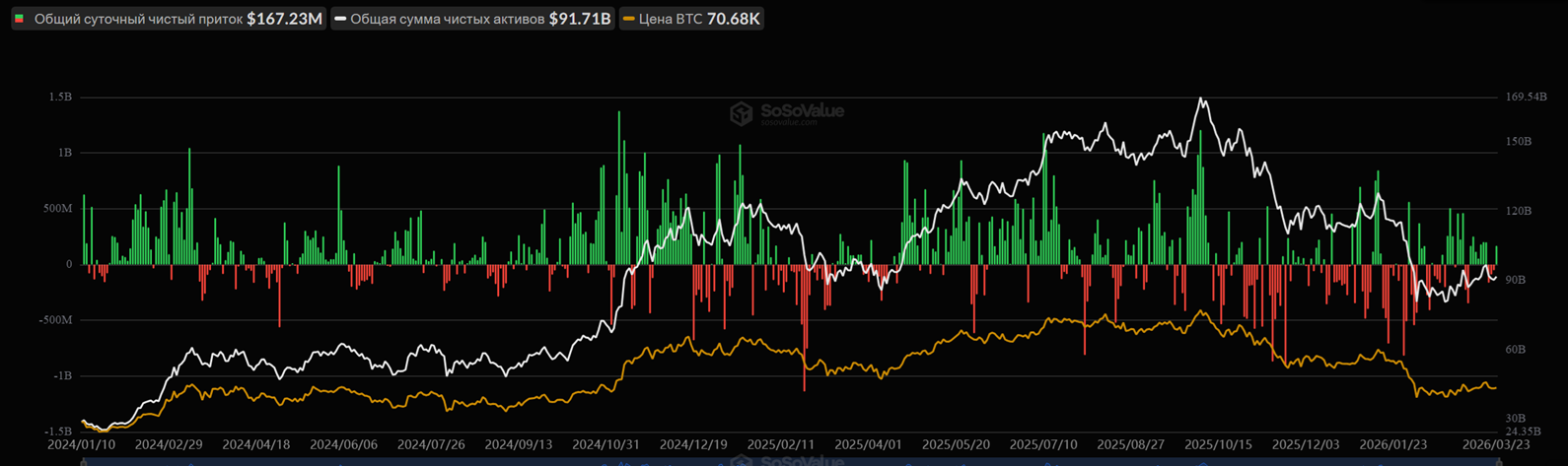 Поступления в спотовые $BTC-ETF составили $167,2 млн. Прежде фиксировалась негативная динамика в течение трех дней подряд.