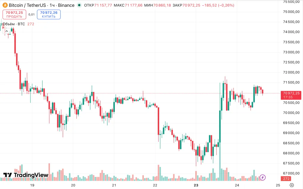 На момент написания цифровое золото торгуется около $71 000. За последние сутки актив подорожал на 0,9%.
