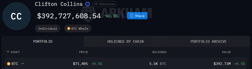 В Arkham подтвердили перевод 500 $BTC. Специалисты идентифицировали 14 адресов Коллинза с общим объемом активов в 5 500 $BTC (~$392,7 млн).