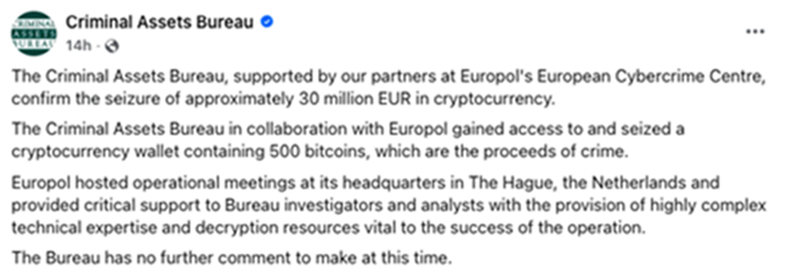 Бюро по борьбе с преступными активами Ирландии в сотрудничестве с Европолом взломала 1 из 12 биткоин-кошельков, связанных с осужденным Клифтоном Коллинзом. Это произошло спустя годы после утраты приватных ключей.