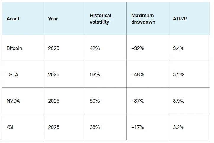 HV биткоина оказалась ниже показателей некоторых акций «Великолепной семерки» — Nvidia (50%) и Tesla (63%) — и не сильно отличалась от фьючерсов на серебро (38%).