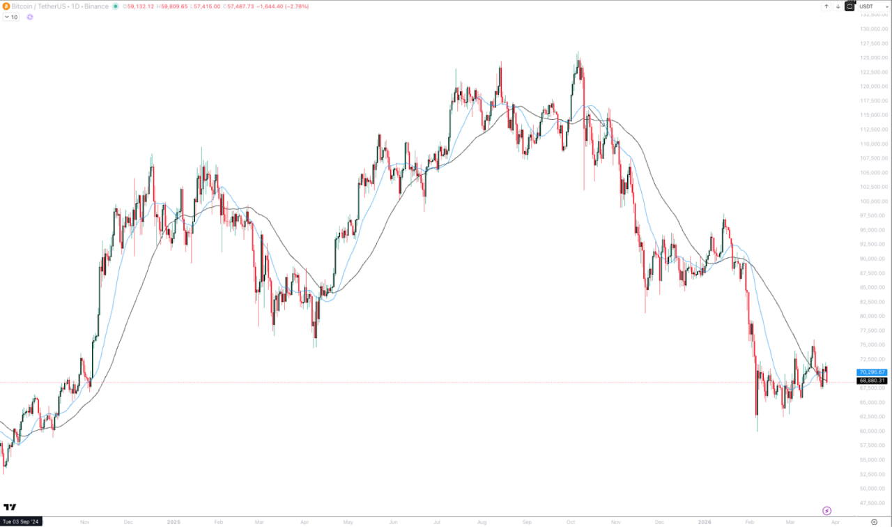 Несмотря на возвращение институционального интереса, сам график остается сложным. Биткоин продолжает консолидироваться и регулярно возвращается ниже $70 000.
