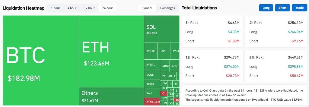 Объем ликвидаций превысил $449 млн за сутки. Большая часть суммы — $398 млн — пришлась на длинные позиции.