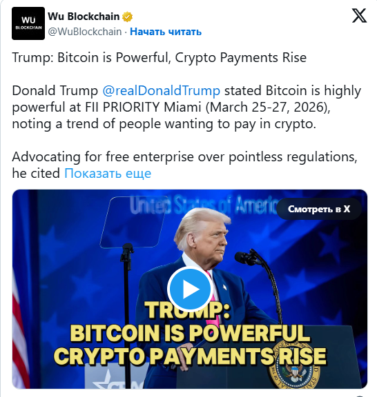 Дональд Трамп снова публично высказался в отношении цифровых активов. Выступая в пятницу на саммите FII PRIORITY Miami 2026, он заявил, что США станут мировой сверхдержавой в сфере биткоина.