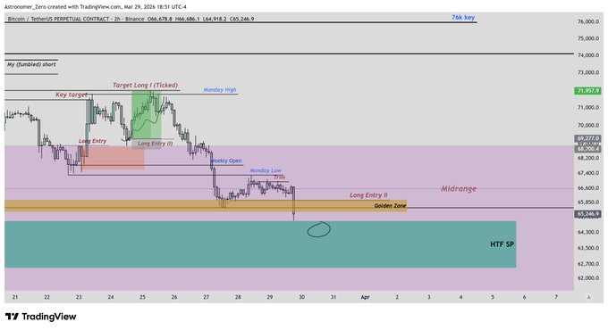 Он ясно дал понять своё управление рисками: если биткоин закроет ежедневную свечу ниже этой зоны, он выходит и терпит убыток. Но его базовый аргумент — уровень держится.