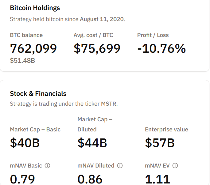 Базовый показатель mNAV демонстрирует иную картину. Для MicroStrategy он составляет 0,79. Рыночная капитализация обыкновенных акций в размере $40 млрд оценивается ниже криптовалютных резервов компании.