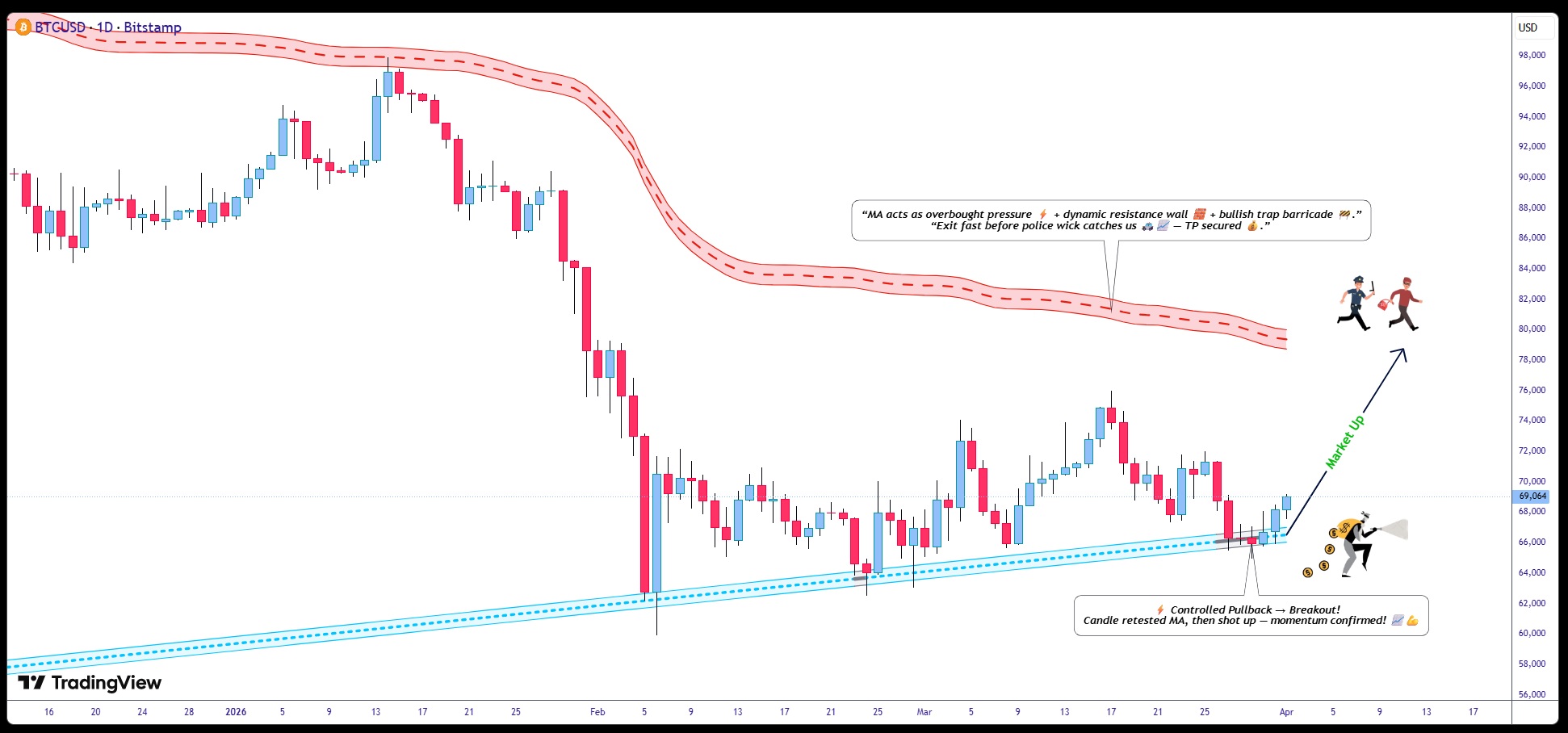 Базовый сценарий (бычий): удержание зоны $66 000 и пробой сопротивления $70 000. Аналитик The-Thief нацелен на зону ликвидности в районе $78 000, однако для этого необходимо закрепиться выше локальных максимумов.