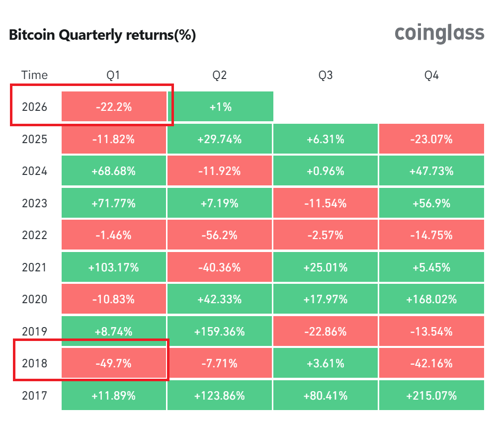 На момент публикации цена первой криптовалюты поднялась к отметке $69 043 после падения ниже $65 200 в начале недели. По данным Coinglass, первый квартал 2026 года завершился падением на 22,2%. Это худший результат с Q1 2018 года, когда актив обвалился почти на 50%.