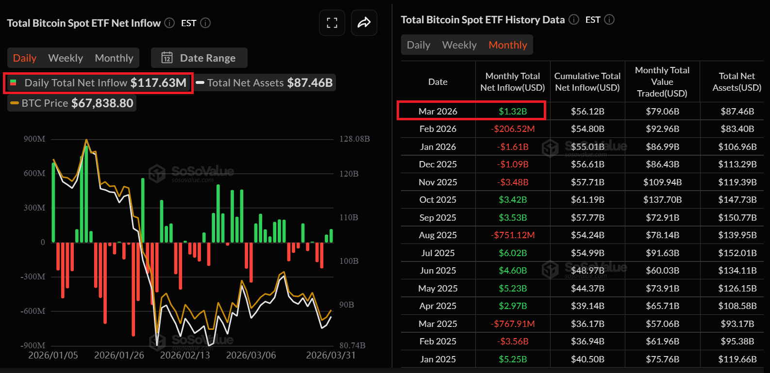 Спотовые биткоин-ETF зафиксировали приток $117,63 млн за сутки, согласно SoSoValue. Март в целом смог частично компенсировать февральские оттоки, показав чистый приток $1,32 млрд.