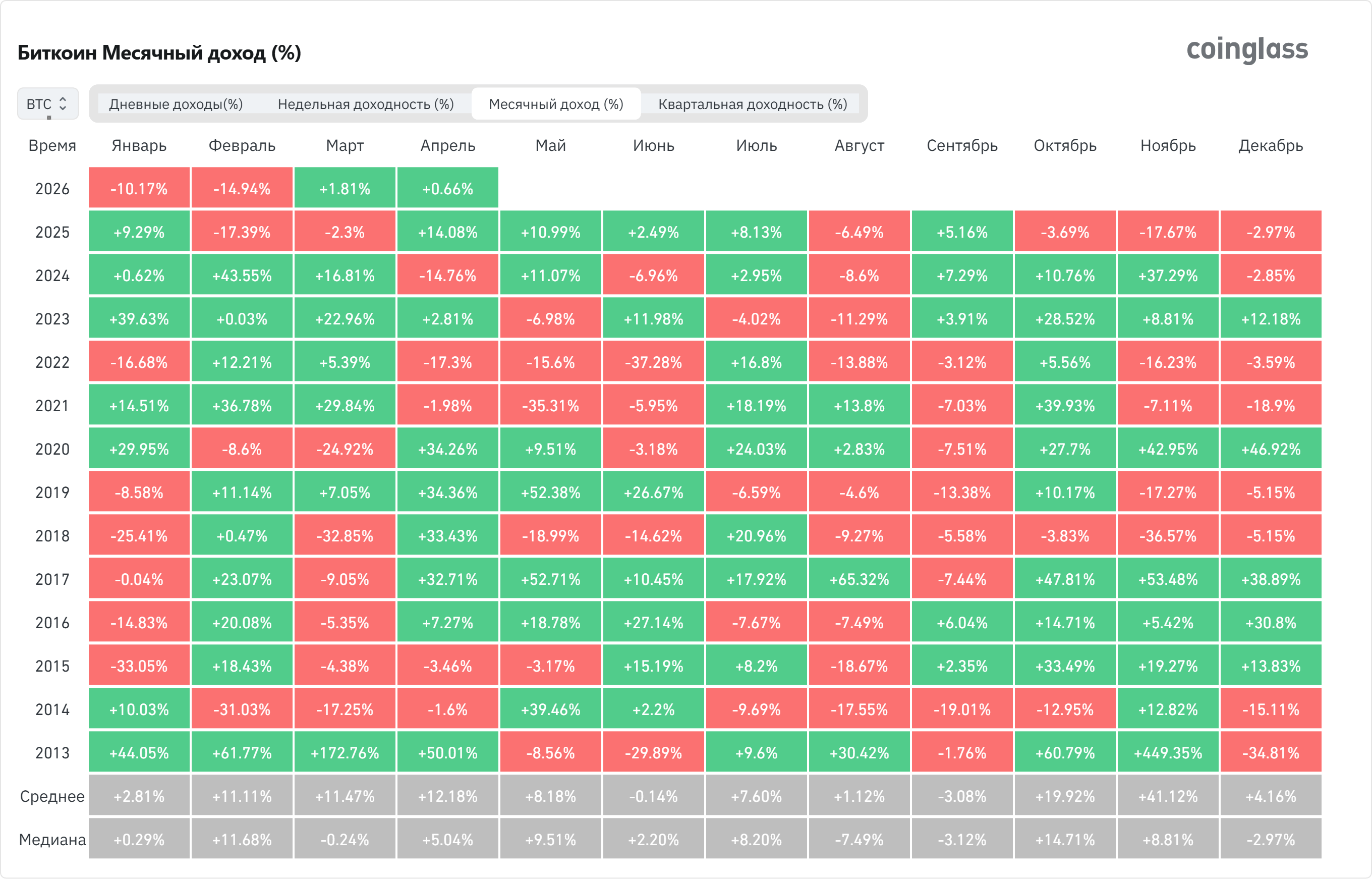 данные управляющей активами компании BlackRock за период с 2013 года. Согласно статистике, длительность снижения котировок от пика до минимума стабильно составляет от 12 до 14 месяцев. Если эта закономерность сохранится применительно к текущей ситуации (учитывая пик октября 2025 года), предполагаемое дно цикла также придется на октябрь или декабрь 2026 года.
