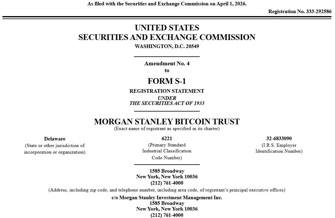 Morgan Stanley, глобальный инвестиционный банк и компания по управлению активами, 1 апреля подал в Комиссию по ценным бумагам и биржам США (SEC) поправку № 4 к регистрационному заявлению по форме S-1 для Morgan Stanley Bitcoin Trust, в которой изложил планы по листингу биржевого фонда (ETF) на биткоине на NYSE Arca под тикером MSBT. В заявке описывается пассивный инструмент, предназначенный для отслеживания динамики цен на биткоин с использованием эталонного индекса.