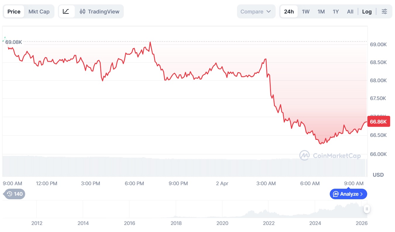 Биткоин упал ниже $67 000 после ралли во вторник.