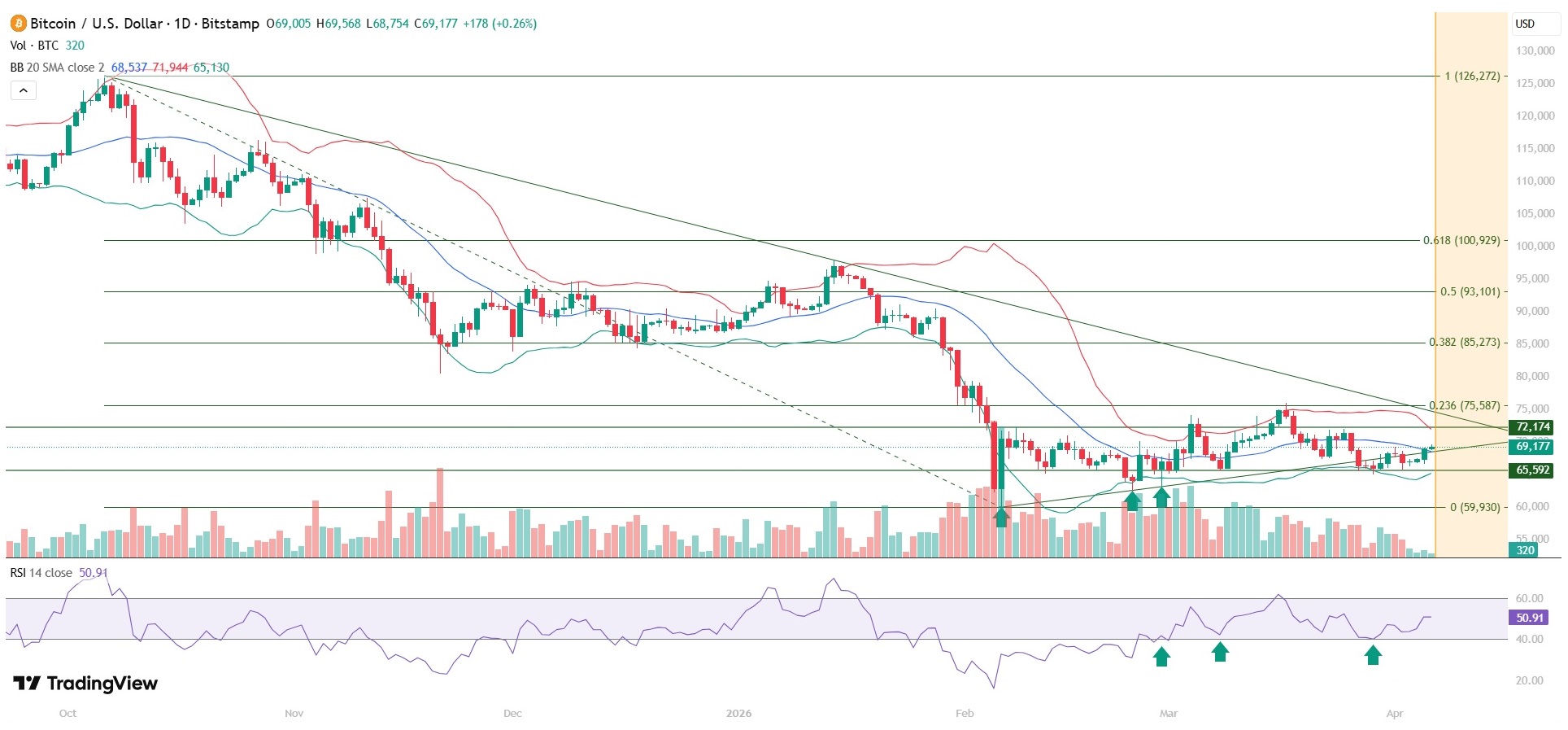 Базовый сценарий: удержание уровня $68 783 (средняя линия Боллинджера). При сохранении покупательского давления целью выступает ключевое сопротивление $72 174. Пробой этого уровня подтвердит выход из пятинедельного канала и откроет путь к Фибоначчи 0.236 на уровне $75 587.