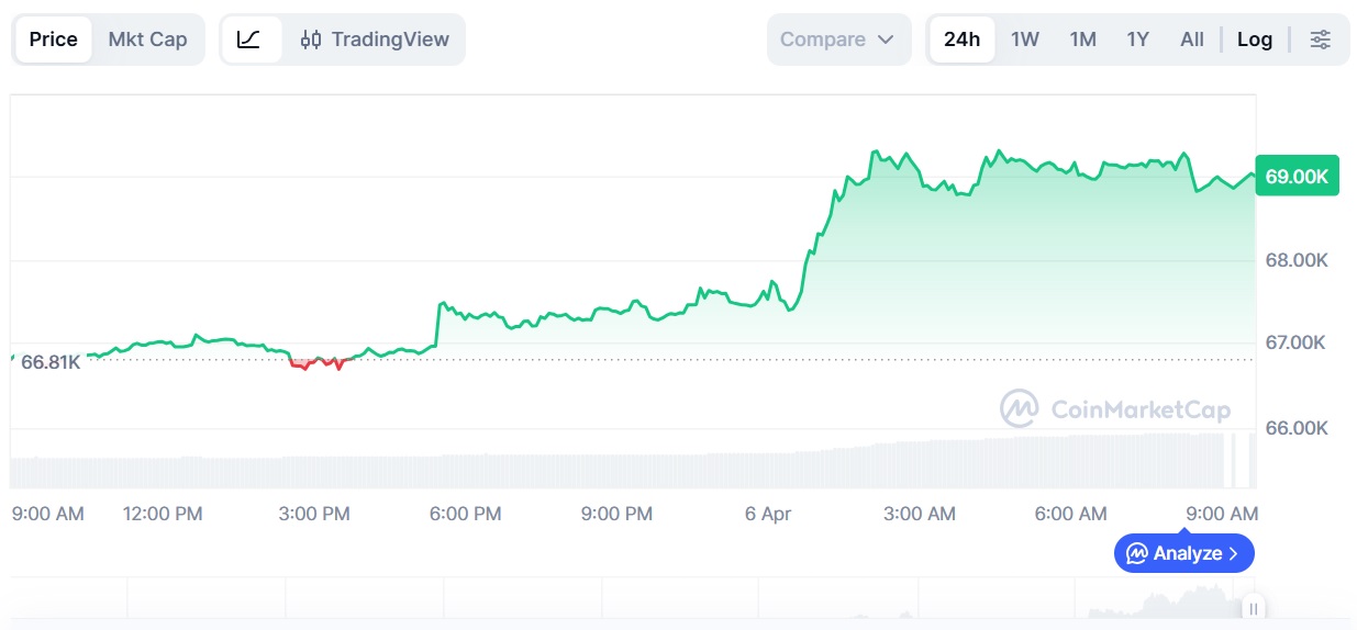 Диапазон дня: $66 690-69 321 (+3,9%).