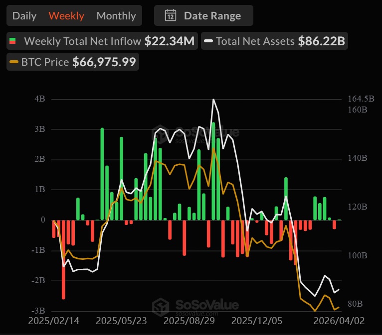 По данным SoSoValue, спотовые биткоин-ETF закрыли прошлую неделю с чистым притоком $22,34 млн.